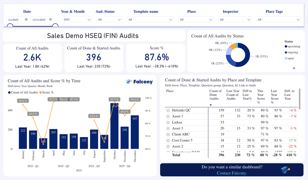 Turn Falcony data into powerful, interactive insights with ready-to-use Power BI dashboards. No modelling, no visual design work, no long projects — just plug in, open the dashboards, and start analysing your operations from day one.