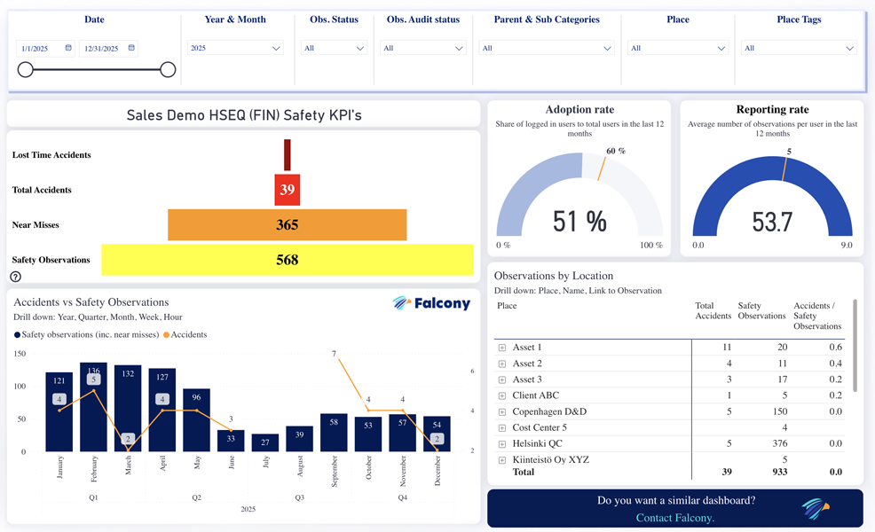 The dashboards are already available for a wide range of use cases, including observations, audits and inspections, risks and risk management, tenant experience, safety KPIs, ESG and carbon accounting, NPS and many more. As Falcony continues to evolve, additional dashboards will be introduced using the same consistent data model and best-practice design principles, ensuring scalability without compromising clarity or usability.